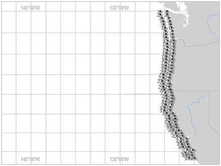 Expanding on the 2009 survey, the Pacific coast survey this year consists of aerial transects flown at 15-mile intervals from Cape Flattery in Washington to southern California, extending 38 miles or more offshore: 26 transects in the Pacific Northwest, and 40 transects in California.